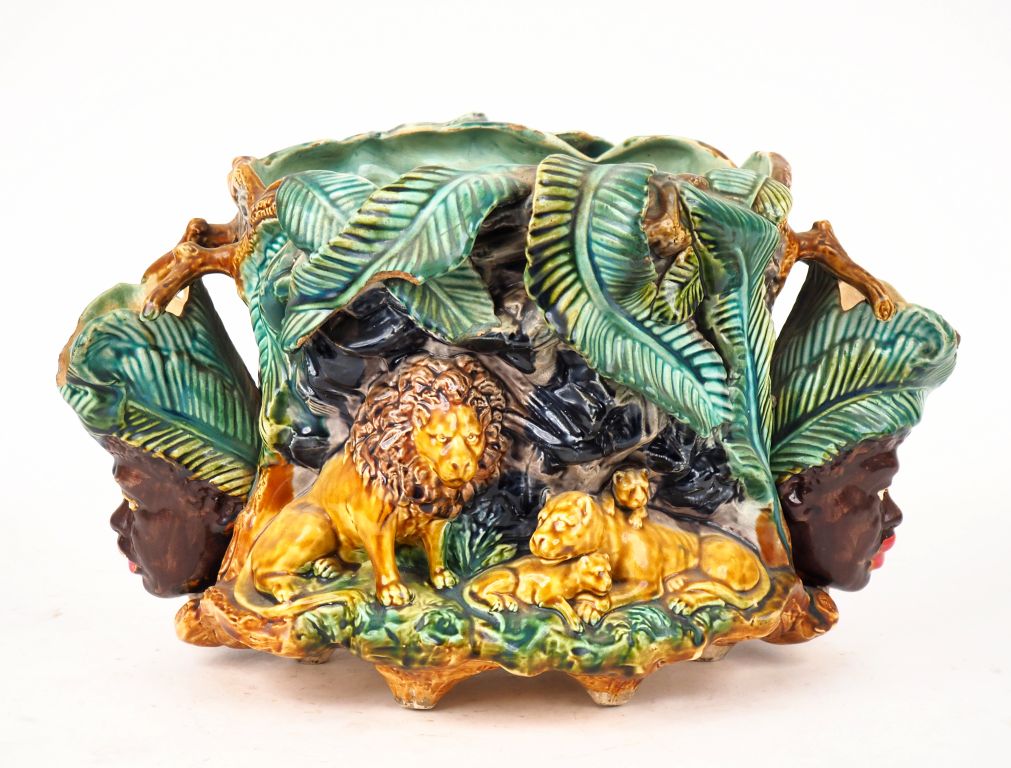 Grand cache pot en barbotine, à décor en relief de têtes d'africains et de lions. (égrenures). Dim. 46 x 22 cm