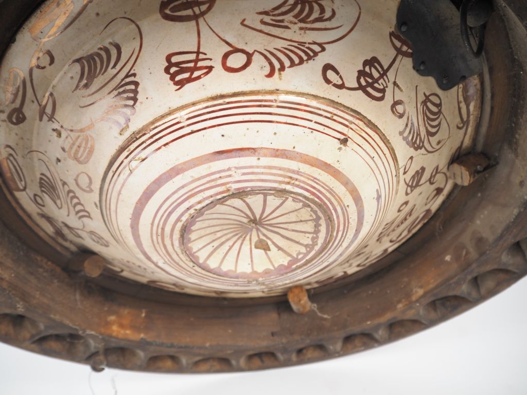 Grand Plat XVIème Hispano-mauresque en faïence lustrée à décor émaillé double face de rinceaux. Encadrement en bois doré postérieur. Diam. 40 cm. (défaut de cuisson)