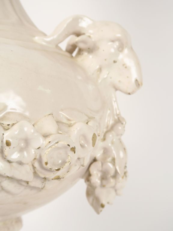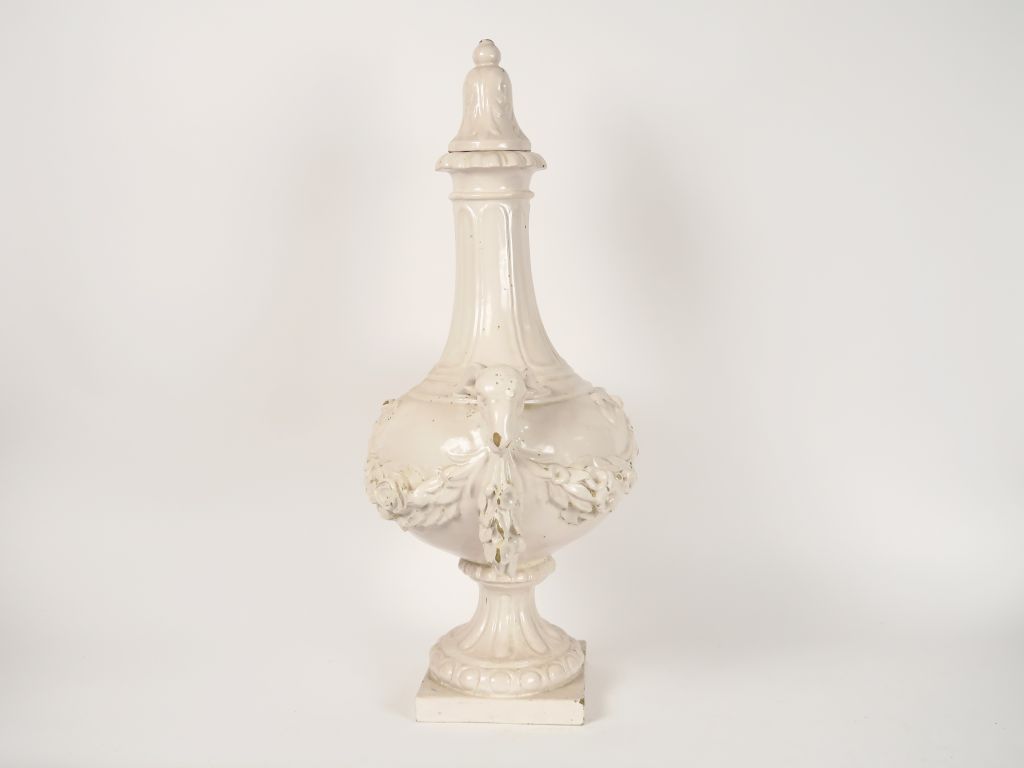 Grand pot couvert de style Louis XVI en faïence blanche, à décor de têtes de bélier, de guirlande de fleurs et de noeud de ruban. H. 66 cm (quelques sauts d'émail)