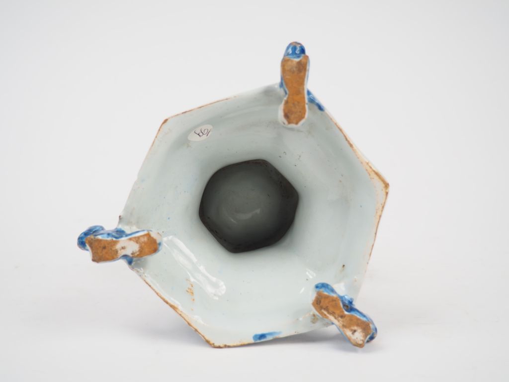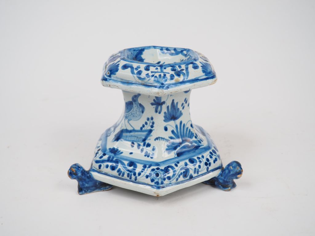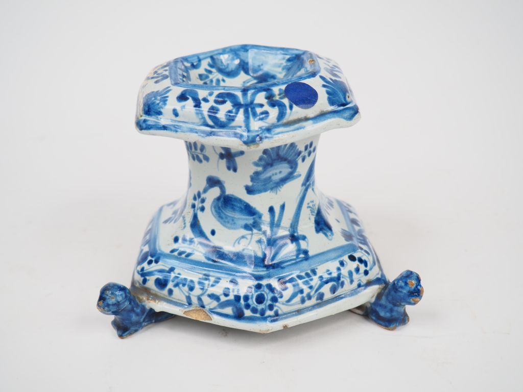Grand saleron XVIIème en faïence, à décor en camaïeu bleu d’oiseaux et de lapin. H. 11 cm (accidents et restaurations)