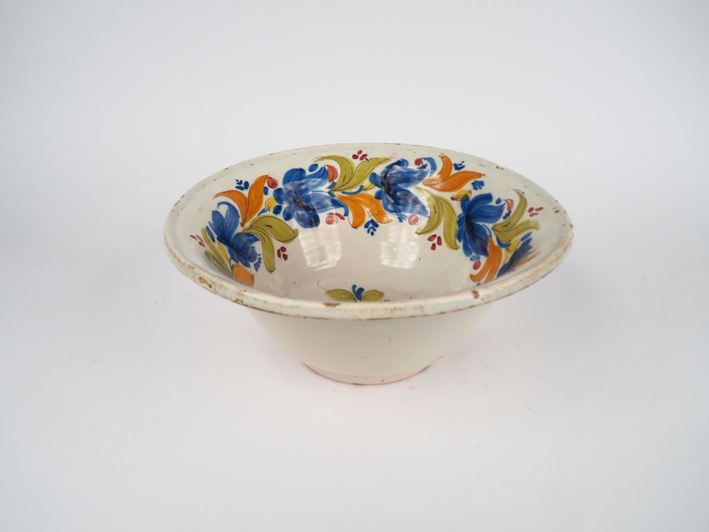 Grande coupe sur talon début XIXème en faïence à décor de fleurs polychromes. Dim. 14,5 x 34 cm. (Sauts d'émail et défauts de cuisson).