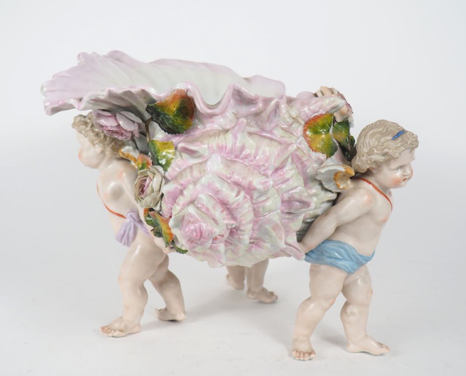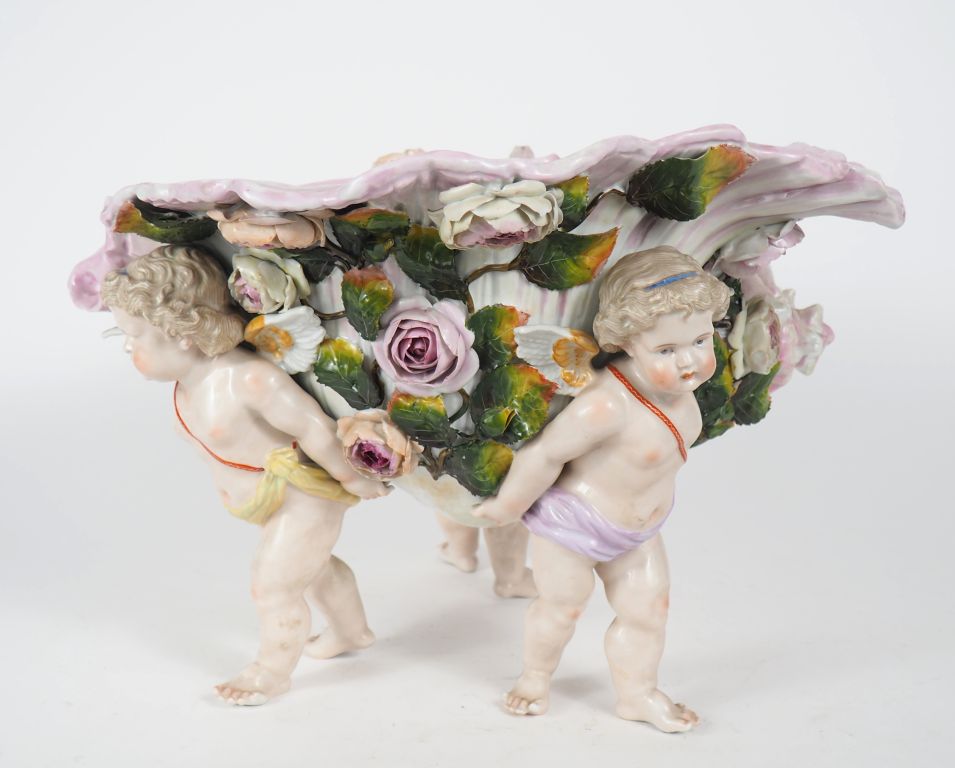 Grande jardinière fin XIXème en porcelaine polychrome en forme d'amours portant un coquillage, agrémentée de roses en relief. Dim. 29 x 43 x 37 cm
