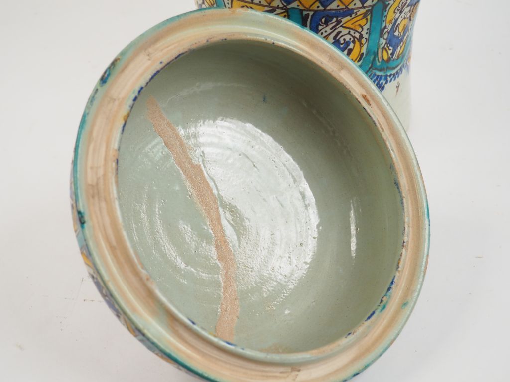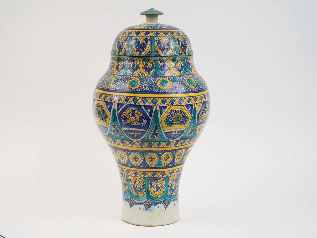 Grande potiche marocaine couverte en faience polychrome. H. 57 cm Largeur. 29 cm (restaurations)