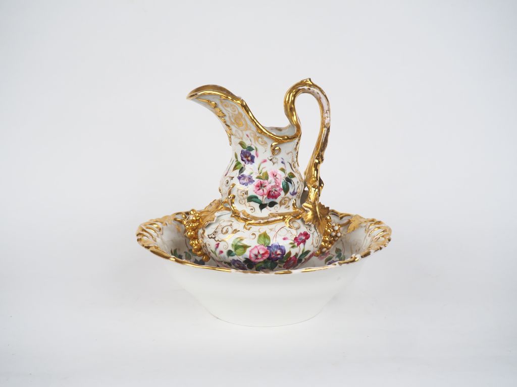 Grande verseuse et son bassin Napoléon III en porcelaine de Paris, Napoléon III à décor de fleurs polychromes et de pampres dorés en relief , bassin ajouré. H. de la verseuse : 30 cm. Dim. du bassin : 32 x 35,5 cm.