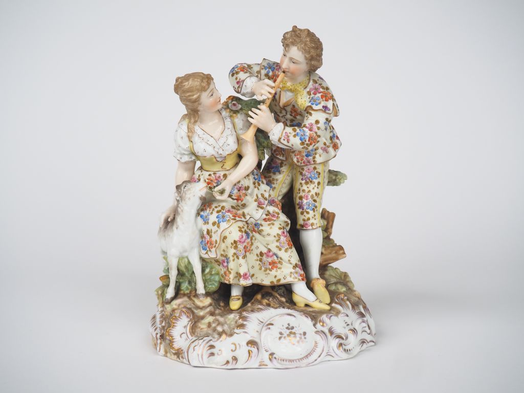 Groupe en porcelaine polychrome de Saxe XIXème, "scène galante". Signé. Dim. 19 x 14 x 11 cm. (petit élément du feuillage cassé et recollé).