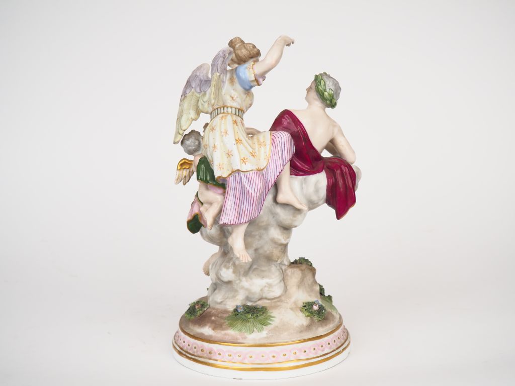 Groupe XIXème en porcelaine polychrome de Saxe figurant une allégorie. Signé. H. 29 cm.