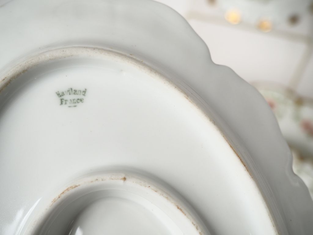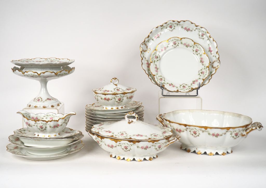 HAVILAND. Partie de service de table en porcelaine de Limoges à décor de roses et de guirlandes de feuillage rehaussées d'or comprenant : 80 pièces. (égrenures, manque le couvercle d'une soupière)