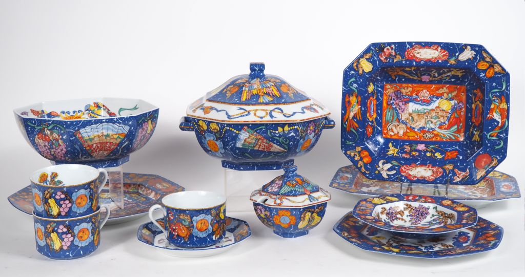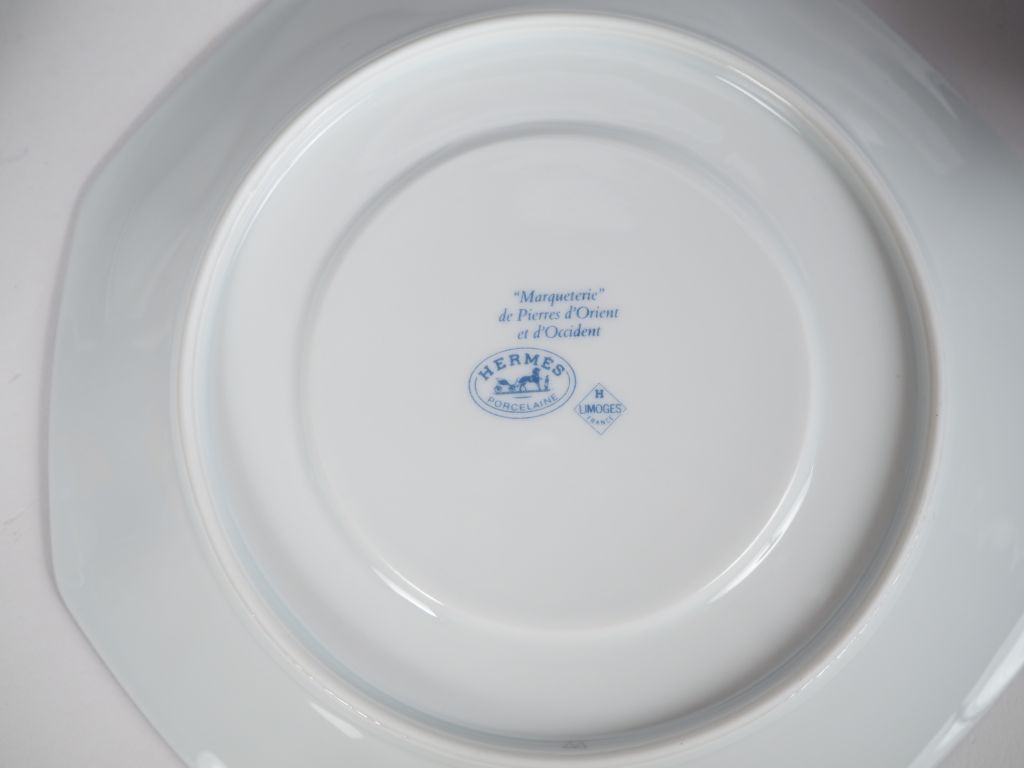 HERMES. Service de table en porcelaine, modèle "Marqueterie de pierres d'Orient et d'Occident", comprenant : - 16 grandes assiettes - 9 assiettes creuses - 1 saucière couverte - 2 plats ronds - 1plat rectangulaire - 1 plat creux - 1 saladier - 1 soupière - 8 tasses et sous tasses Signé (quelques égrenures)