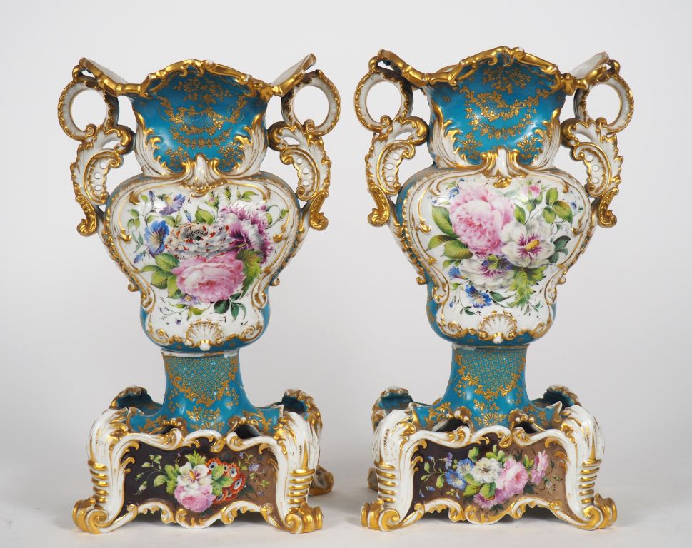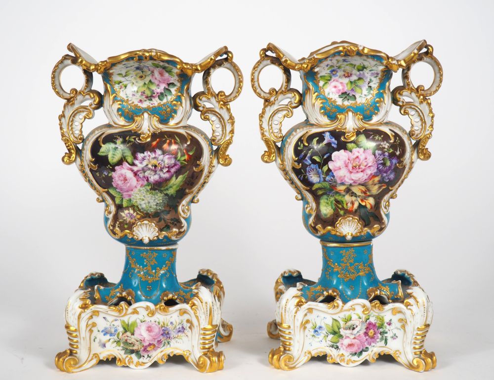 Jacob PETIT. Paire de vases en porcelaine à décor de fleurs polychromes et d'émail doré sur fond blanc turquoise et brun, anses ajourées. Signés. H. 36 cm (manques et égrenures)