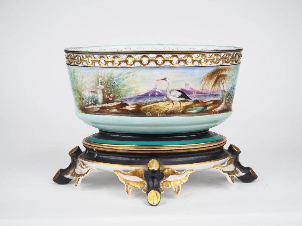Jardinière Napoléon III en porcelaine à décor polychrome de paysage lacustre animé sur fond céladon. Dim. 22,5 x 34 x 24,5 cm.