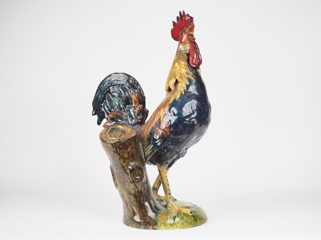 Jérôme MASSIER. "Coq chantant". Sculpture en faïence polychrome de Vallauris. Signée H. 60 cm