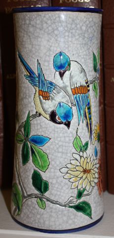 Jules VIEILLARD, Bordeaux. Fin du XIXe siècle. Vase en céramique émaillée à décor d’oiseaux branchés. Signé. H. : 17,5 cm