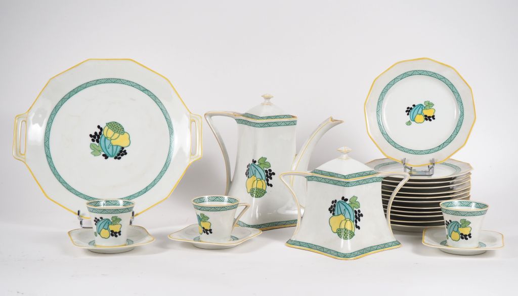 LANTERNIER à Limoges. Partie de service à café en porcelaine à décor polychrome de style Art Déco. Comprenant : - Une cafetière - Un sucrier - Un plat à gateau - 12 assiettes à dessert - 10 tasses et sous tasses