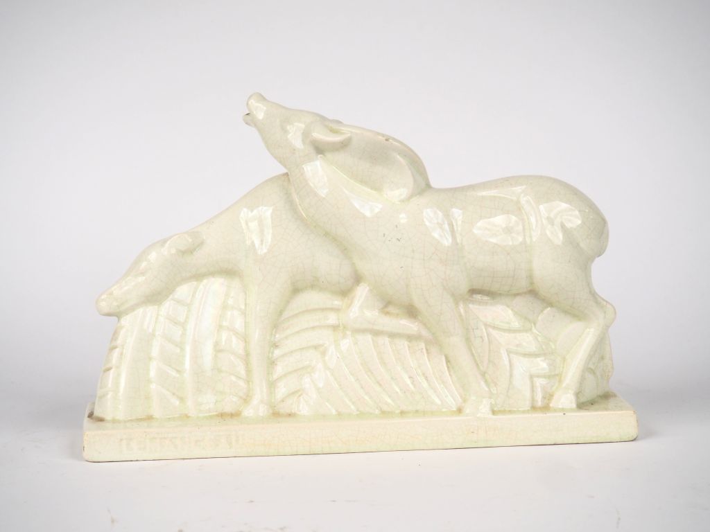 LEMANCEAU. "Biches". Sculpture en faïence craquelée de St Clément. Signée. Dim. 22,3 x 35 x 8,6 cm.