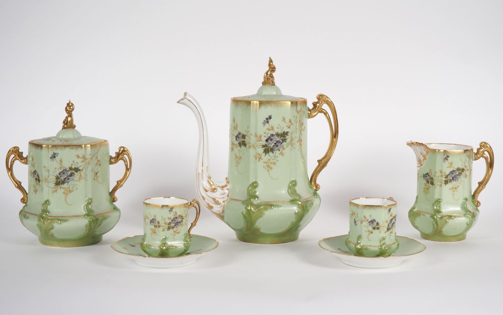 LIMOGES. Partie de service à café en porcelaine à décor émaillé polychrome et doré de fleurs sur fond célandon, comprenant : - Une cafetière ( petite égrenure sur la prise du couvercle) - Un sucrier - Un pot à lait - 7 tasses et sous tasses