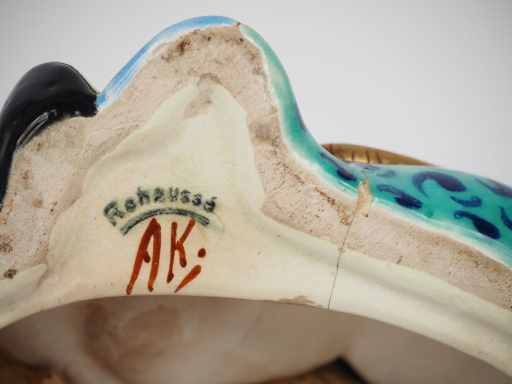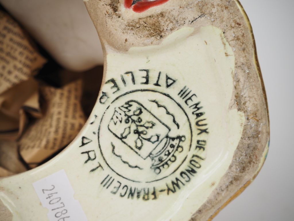 LONGWY. Sujet en céramique polychrome "chinois assis". (grands fels) H. 32,5 cm