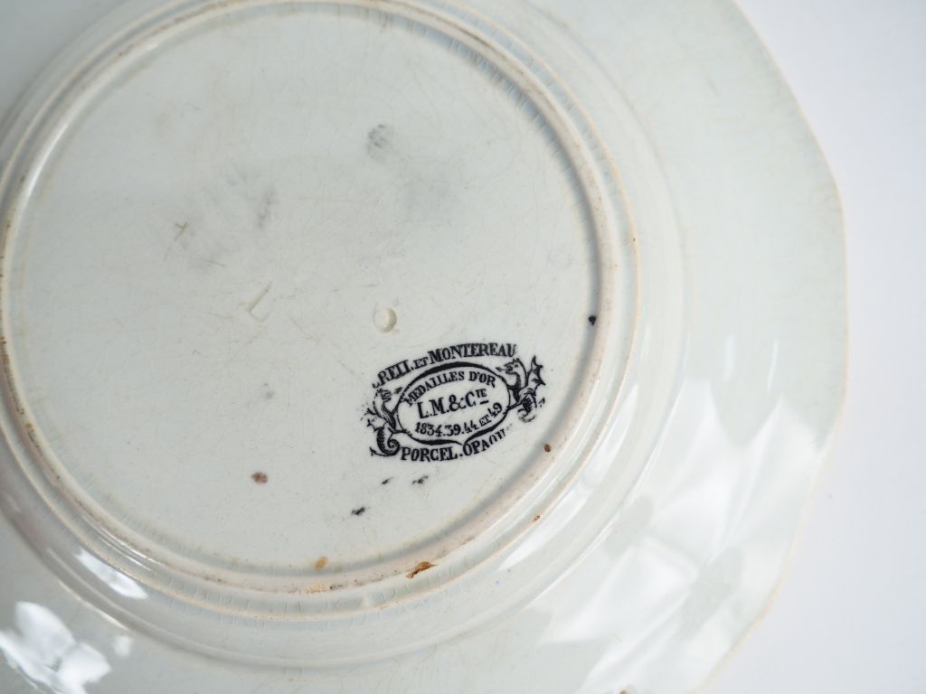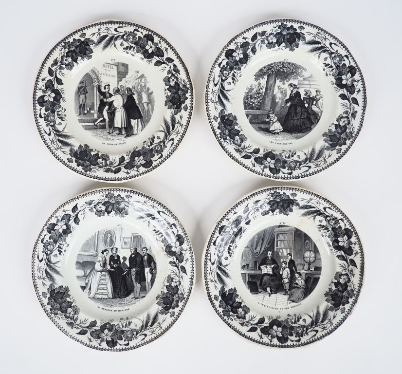 Manufacture de CREIL et MONTEREAU. 4 assiettes en faïence à décor en grisaille, "les premiers pas", "la conscription", "l'instruction de ses enfants", "la demande en mariage". Diam. 19,5 cm. (Fels).