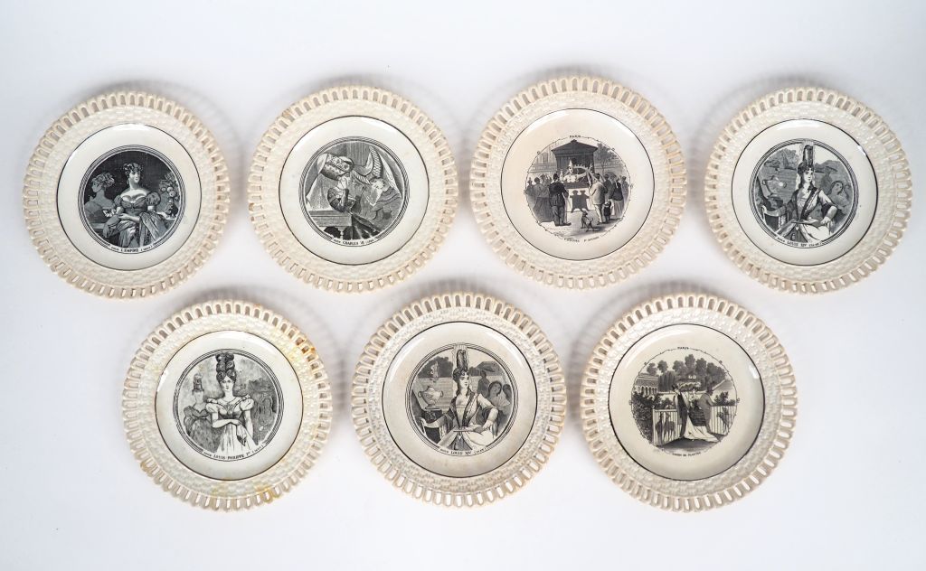 Manufacture de LONGWY. 7 assiettes en faïence ajourée à décor en grisaille. Signées. Diam. 19,5 cm. (Petits accidents).