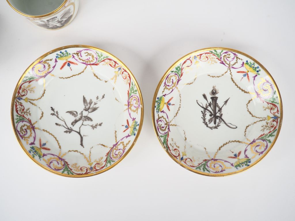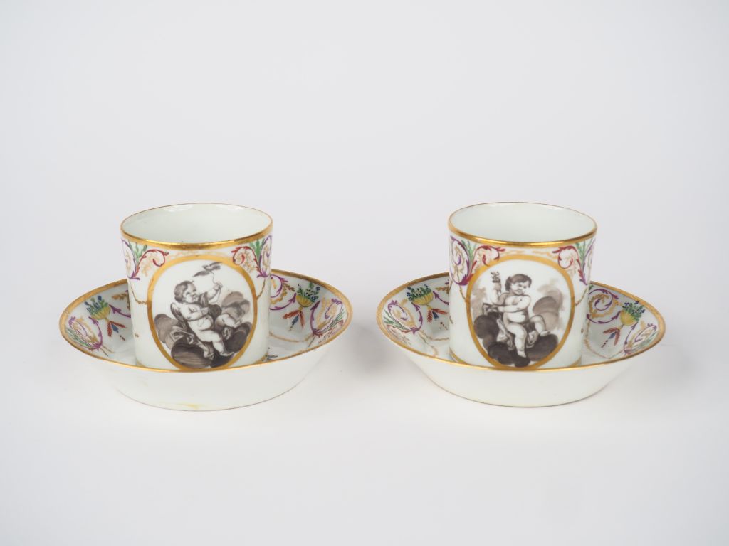 Manufacture du DUC d'ANGOULEME. Paire de tasses et sous tasses XVIIIème en porcelaine à décor d'angelots en grisaille dans des réserves. Signées. Dim. (tasse) : 6,7 x 9 x 7 cm. Dim. (sous tasse) : 2,3 x 13,5 cm.
