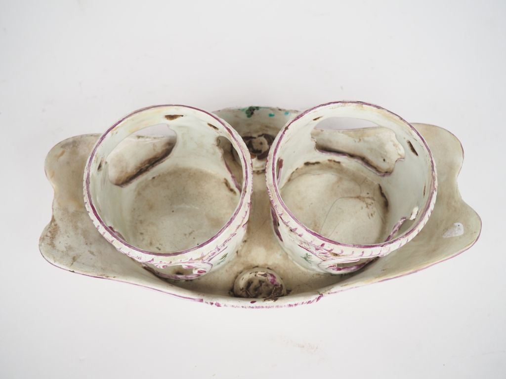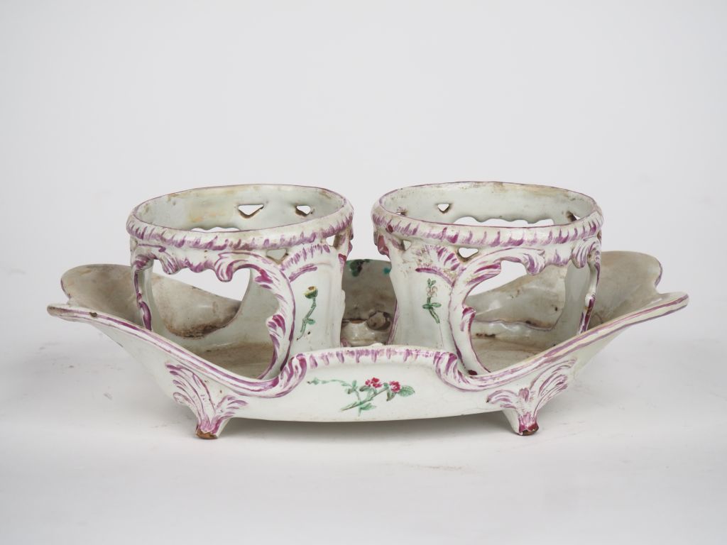 MARSEILLE. Porte-huilier en faïence de petit feu (incomplet, restauré). XVIIIème siècle. H. : 8,5 cm , L. : 26 cm
