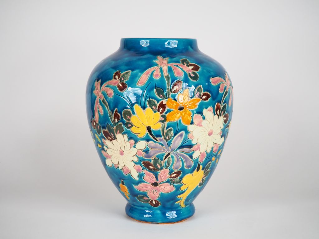 MAUNIER à Vallauris. Grand vase ovoide en céramique à décor de fleurs polychromes sur fond turquoise. Signé H. 32 cm