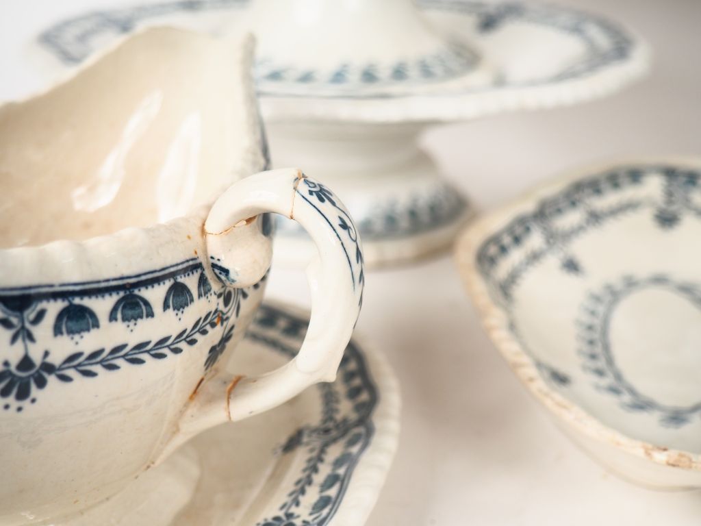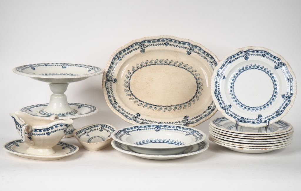 MINTON. Service de table en faience fine, à décor de feuillage en camaieu bleu vert comprenant : 76 pièces. (fels, égrenures, une anse de la saucière cassée recollée)