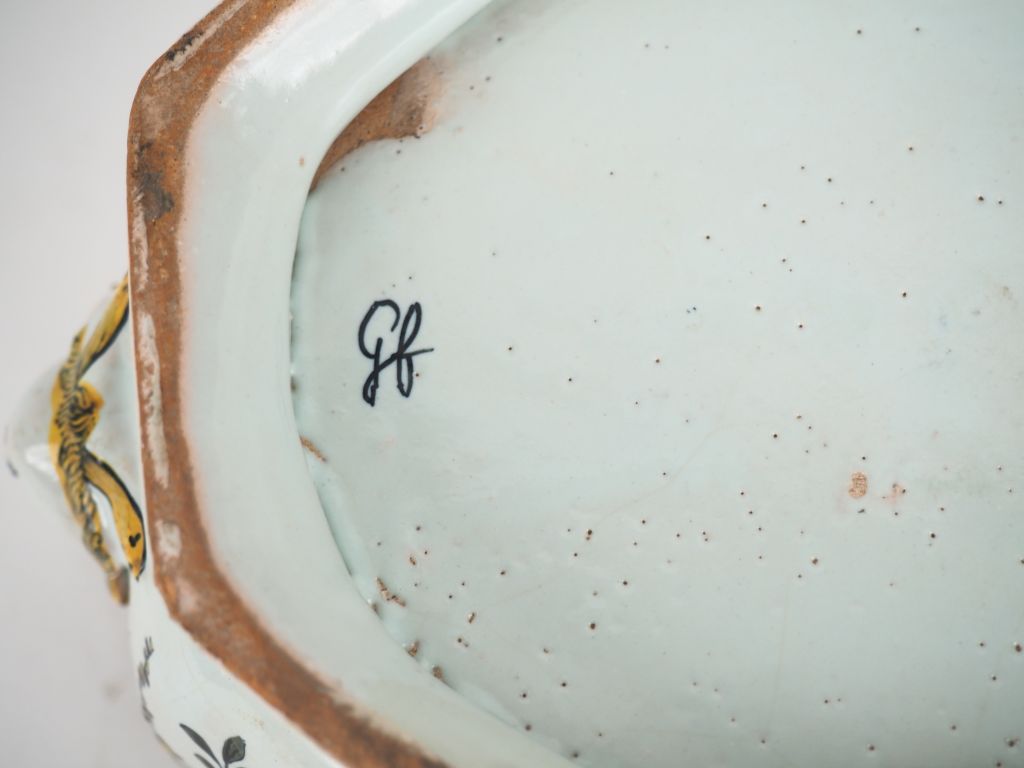 Monture d’huilier vinaigrier en faïence polychrome, dans le goût de Rouen, monogrammée GF, à décor de fleurs polychromes et de masques Dim. 8 x 23 x 16,5 cm
