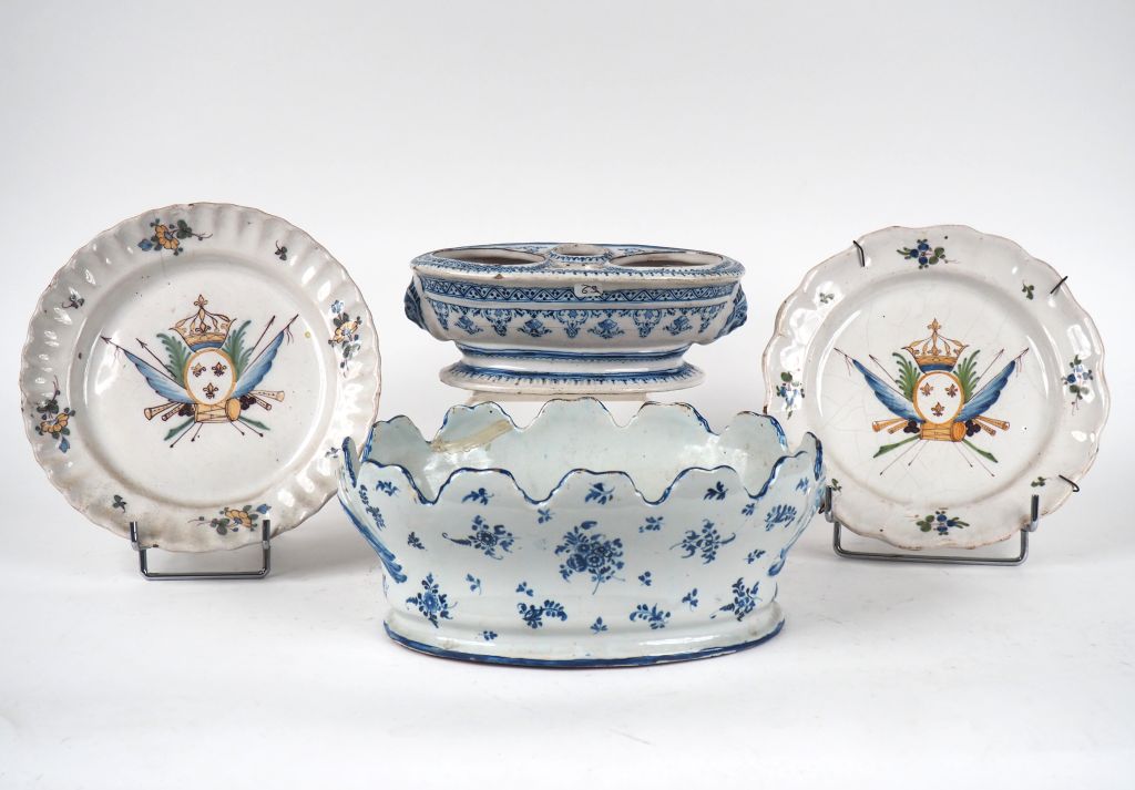 Monture d'huilier XVIIIème en faience de Moustiers décor en camaieu bleu de mascarons et de lambrequins (fel d'émail, cheveu) Dim. 9 x 25 x 15 cm On y joint une verrière en faience de Toulouse XVIIIème décor en camaieu bleu à la bridille (accident) Dim. 11,5 x 29 x 19,5 cm 2 différentes assiettes en faience du Midi fin XVIIIème, aux armes de France
