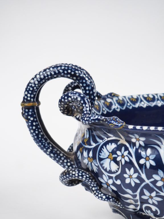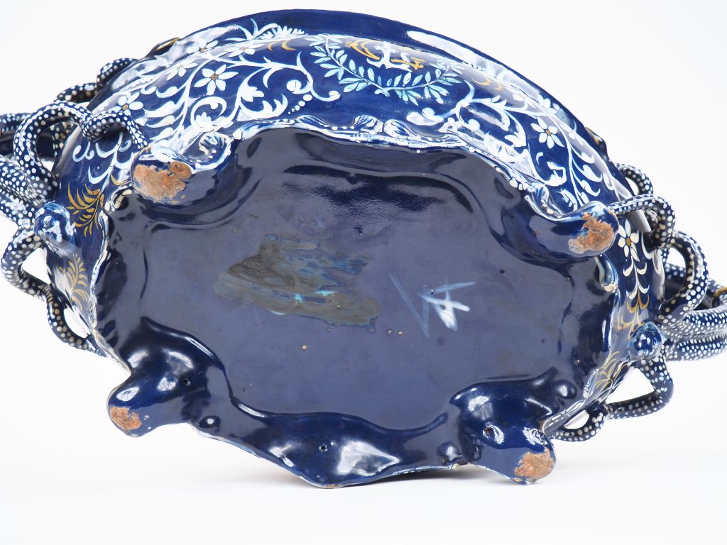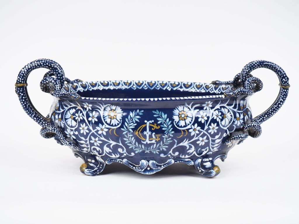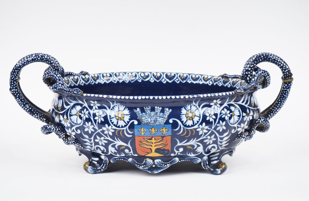 NEVERS. Grande jardinière en émaux sur cuivre à décor d'armoiries, de fleurs, sur fond bleu nuit, anses en forme de serpent moucheté. Dim. 16 x 55 x 30 cm