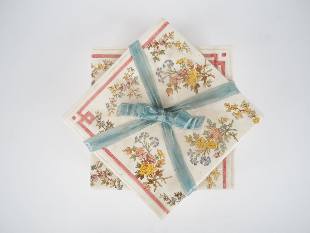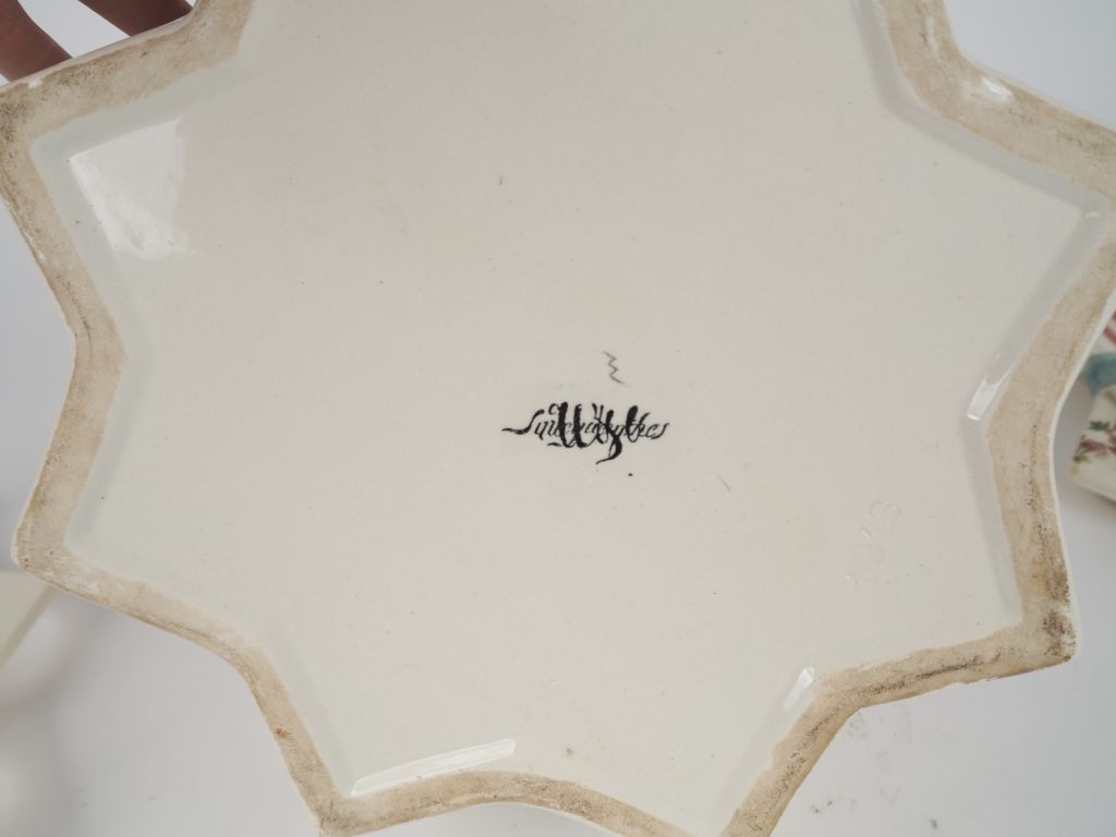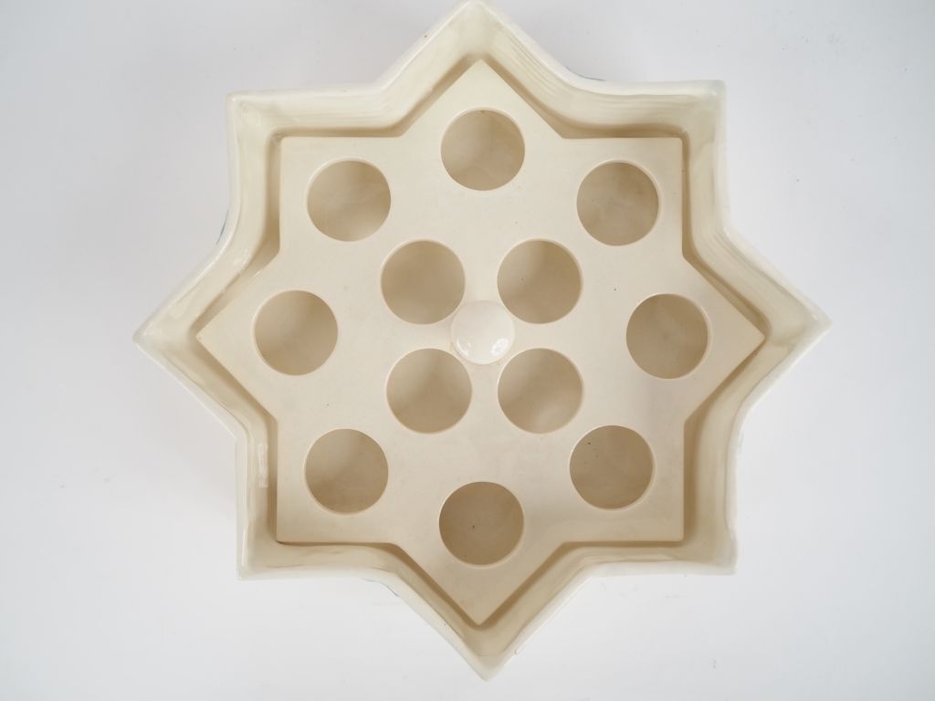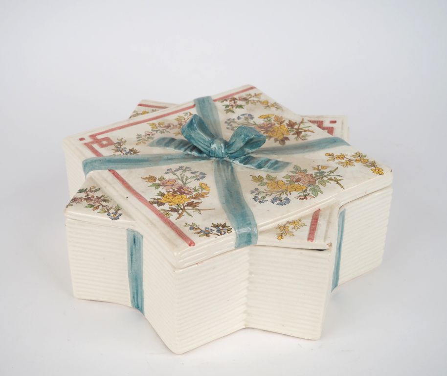 Oeufrier en céramique de Sarreguemines, en forme d'étoile, à décor de nœud de ruban et de fleurs polychromes. Dim. 13 x 27 x 26,5 cm