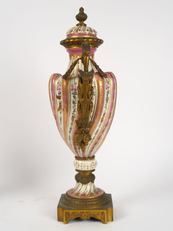 Paire de grands vases couverts Napoléon III de style Louis XVI en porcelaine de Sèvres, à décor de frises de fleurs et de côtes torses à fond rose rehaussé d’or, belle ornementation de bronze. H. 52 cm (accidents)