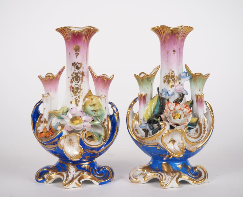 Paire de pique-fleurs Napoléon III en porcelaine polychrome de Paris à décor de fleurs en relief. H. 16,5 cm