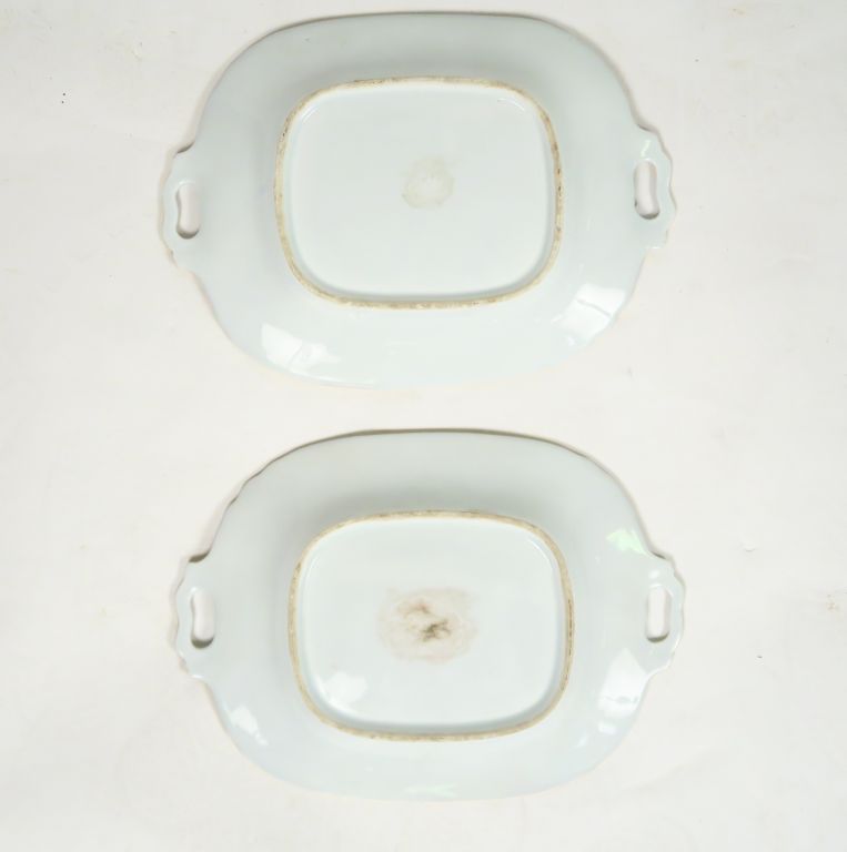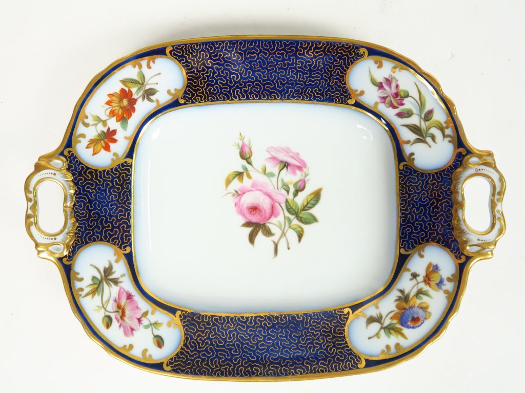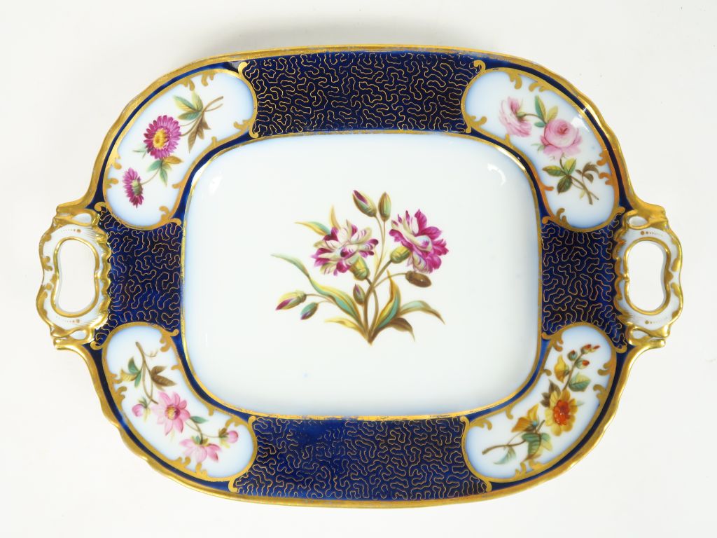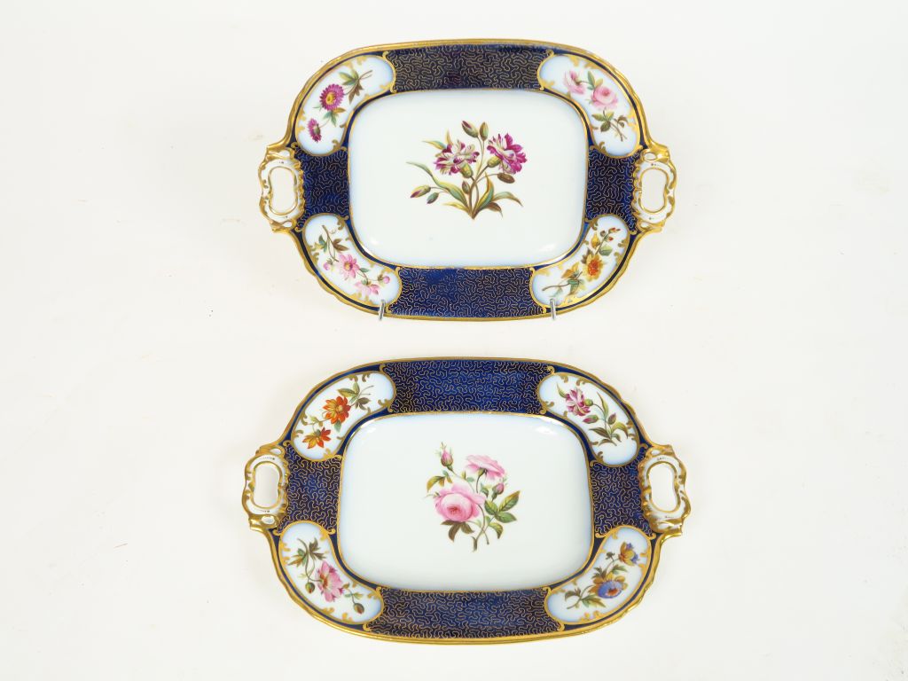 Paire de plateaux XIXème en porcelaine de Valentine, à décor de fleurs polychromes dans des réserves, sur fond bleu de four rehaussé d’or.