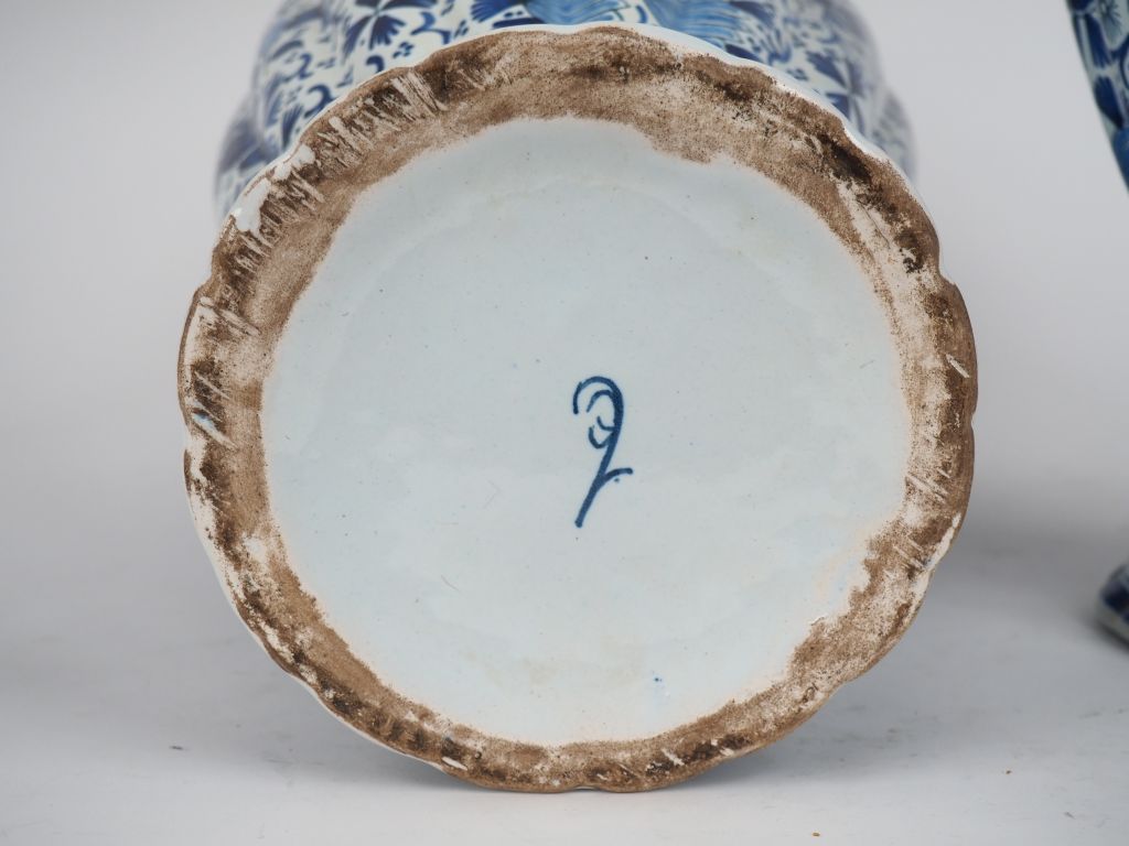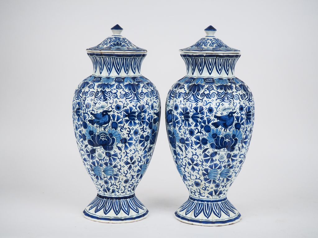Paire de potiches couvertes XIXème en faïence de Delft, décor en camaïeu bleu de fleurs et d’oiseaux, H. 44 cm