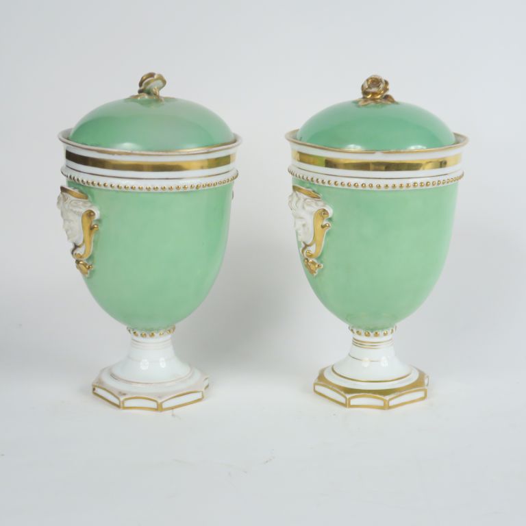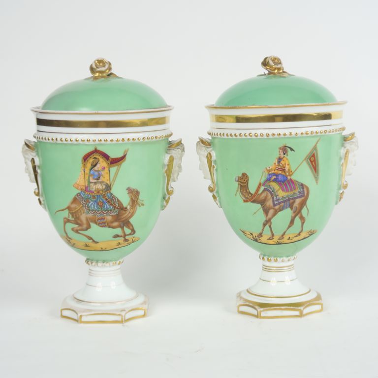 Paire de pots couverts 1900 en porcelaine polychrome, à décor de dignitaires persans sur des chameaux, fond vert et blanc rehaussé d'or, anses en biscuit à décor de tête de personnage (petites égrenures sur un des couvercles) H. 32 cm