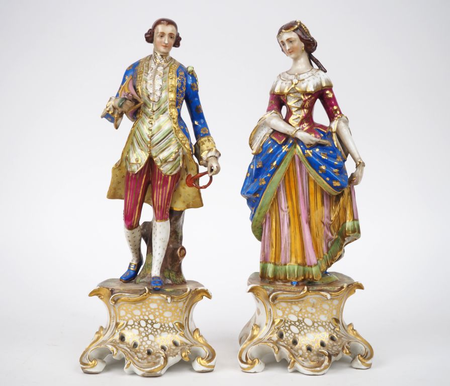 Paire de sujets XIXème en porcelaine polychrome de Paris, "élégants du Directoire". H. 36 cm.