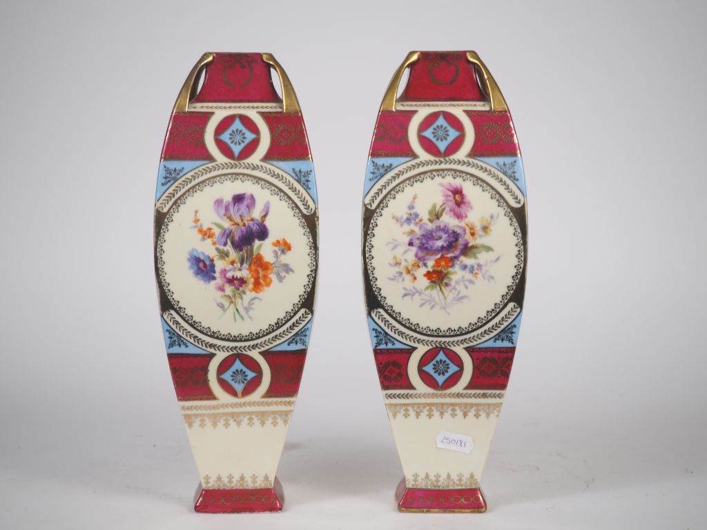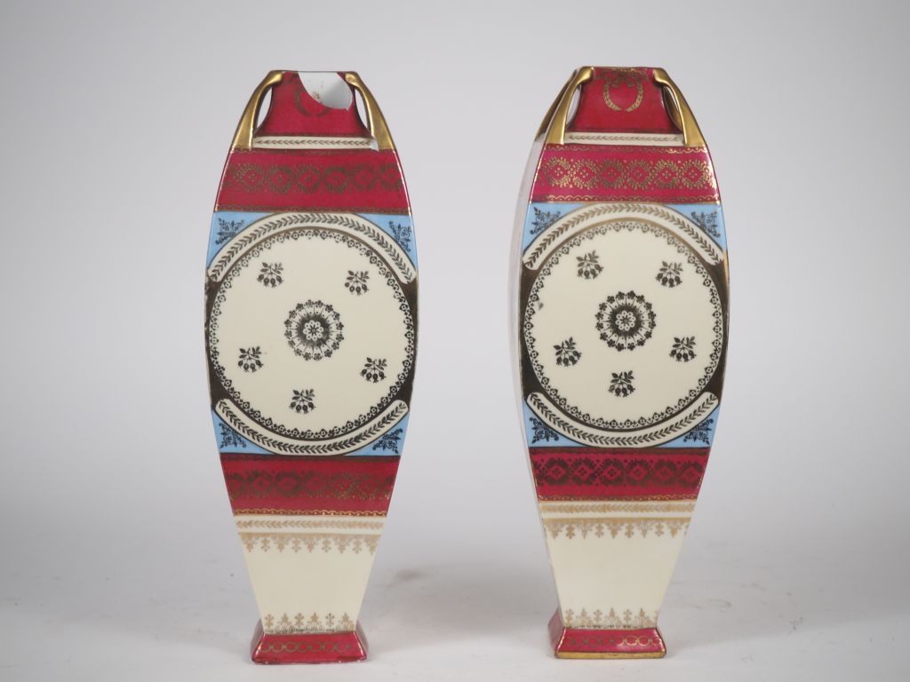 Paire de vases 1900 en porcelaine à décor polychrome et doré de scènes à l'antique dans des réserves, sur fond lie de vin, bleu et crème. H. 31 cm. (L'un accidenté au col).