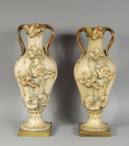 Paire de vases Art Nouveau en céramique, à décor en léger relief de fleurs sur fond crème nuancé vert. H. : 54,5 cm