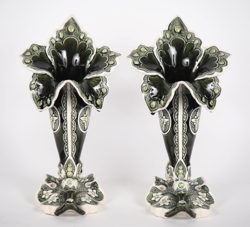 Paire de vases cornet en barbotine polychrome figurant deux fleurs épanouies. H. 34 cm. ( petit éclat)