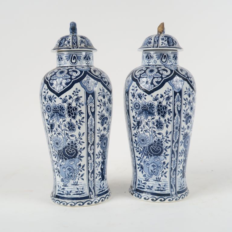 Paire de vases couverts en faïence de Delft à décor en camaïeu de bleu de fleurs dans des réserves. H. 33 cm. (Petits accidents)