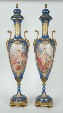 Paire de vases couverts Napoléon III de style Louis XVI en porcelaine de Sèvres à décor dans des réserves de scènes galantes et de paysages lacustre, sur fond bleu turquoise rehaussé d'or. Peintures signées Lucot. Très belle monture en bronze ciselé et doré. H.80 cm