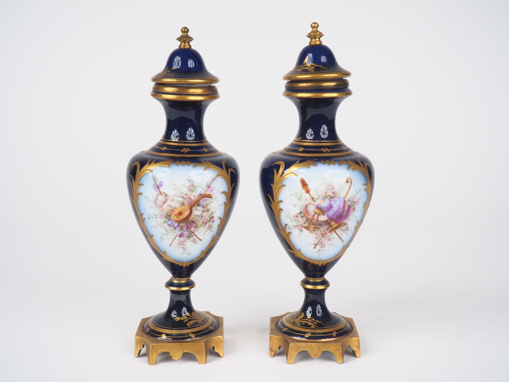 Paire de vases couverts Napoléon III en porcelaine de style Louis XVI à décor de portraits d'élégantes et de trophées dans des réserves sur fond bleu nuit et doré, monture en bronze. Signés. H. 15 cm.