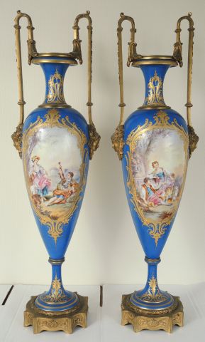 Paire de vases de style Louis XVI en porcelaine de Sèvres à décor dans des réserves de scène galante et de paysages sur fond bleu roi rehaussé d’or, belle monture en bronze doré à décor de masques et de feuillage. Peintures signées Amblet. H. 65.5 cm