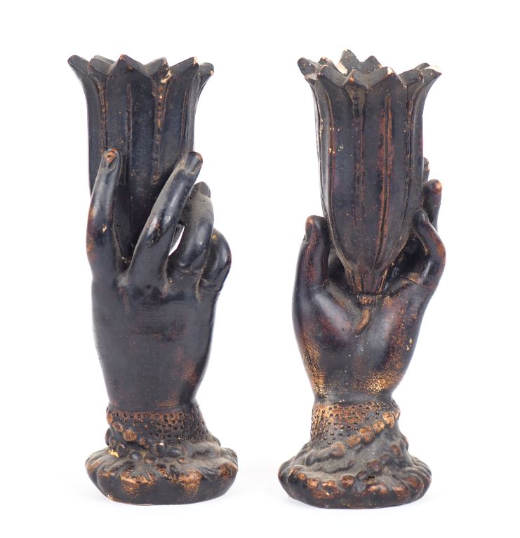 Paire de vases fin XIXème début XXème en plâtre patiné brun en forme de main présentant une fleur. H. 23 cm. (Egrenures).