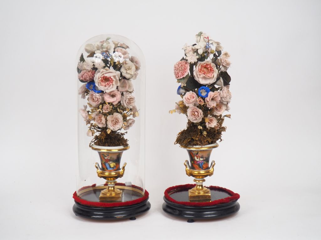 Paire de vases Médicis porte bouquet XIXème en porcelaine de Paris à décor de paysages animés. (Manque un globe) H. 17 cm. H. totale : 55 cm