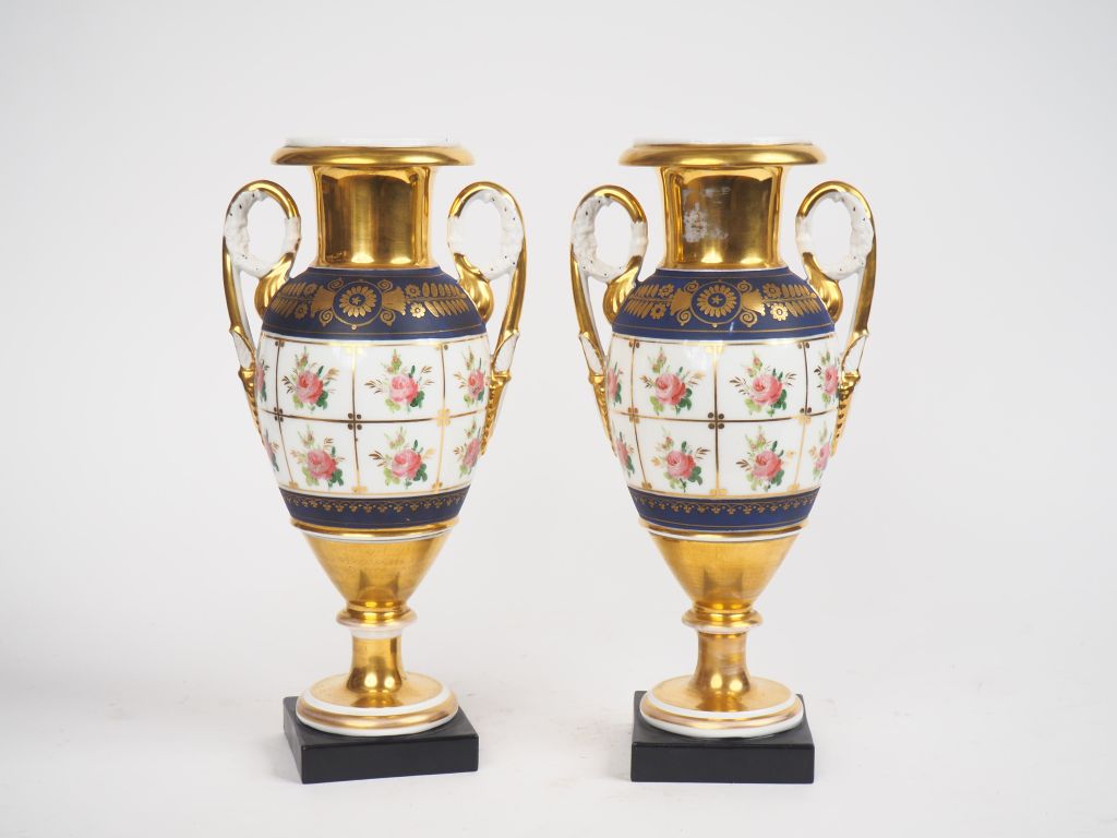 Paire de vases Napoléon III de style Empire en porcelaine polychrome à décor de fleurs sur fond bleu et or. H. 31 cm.
