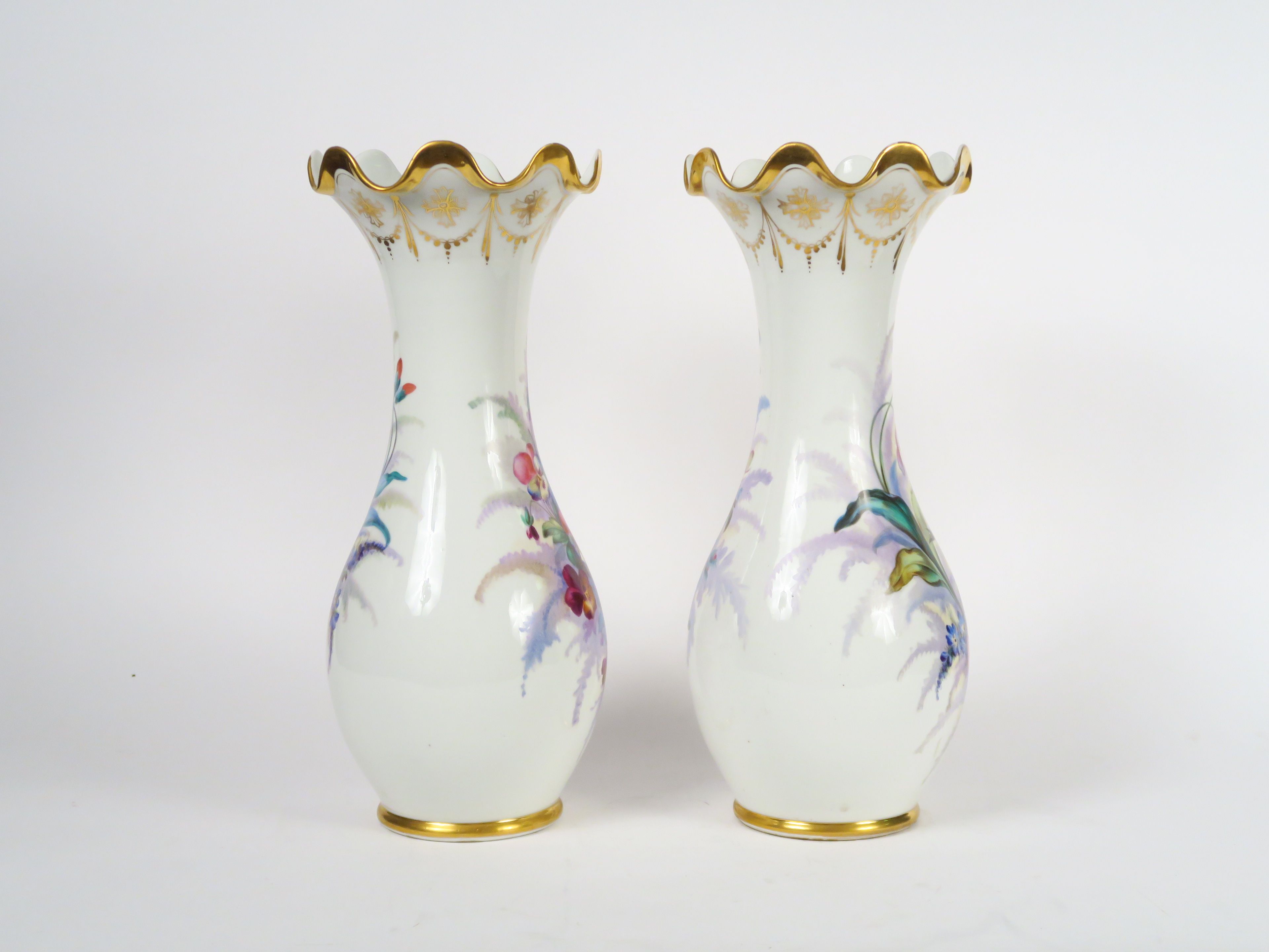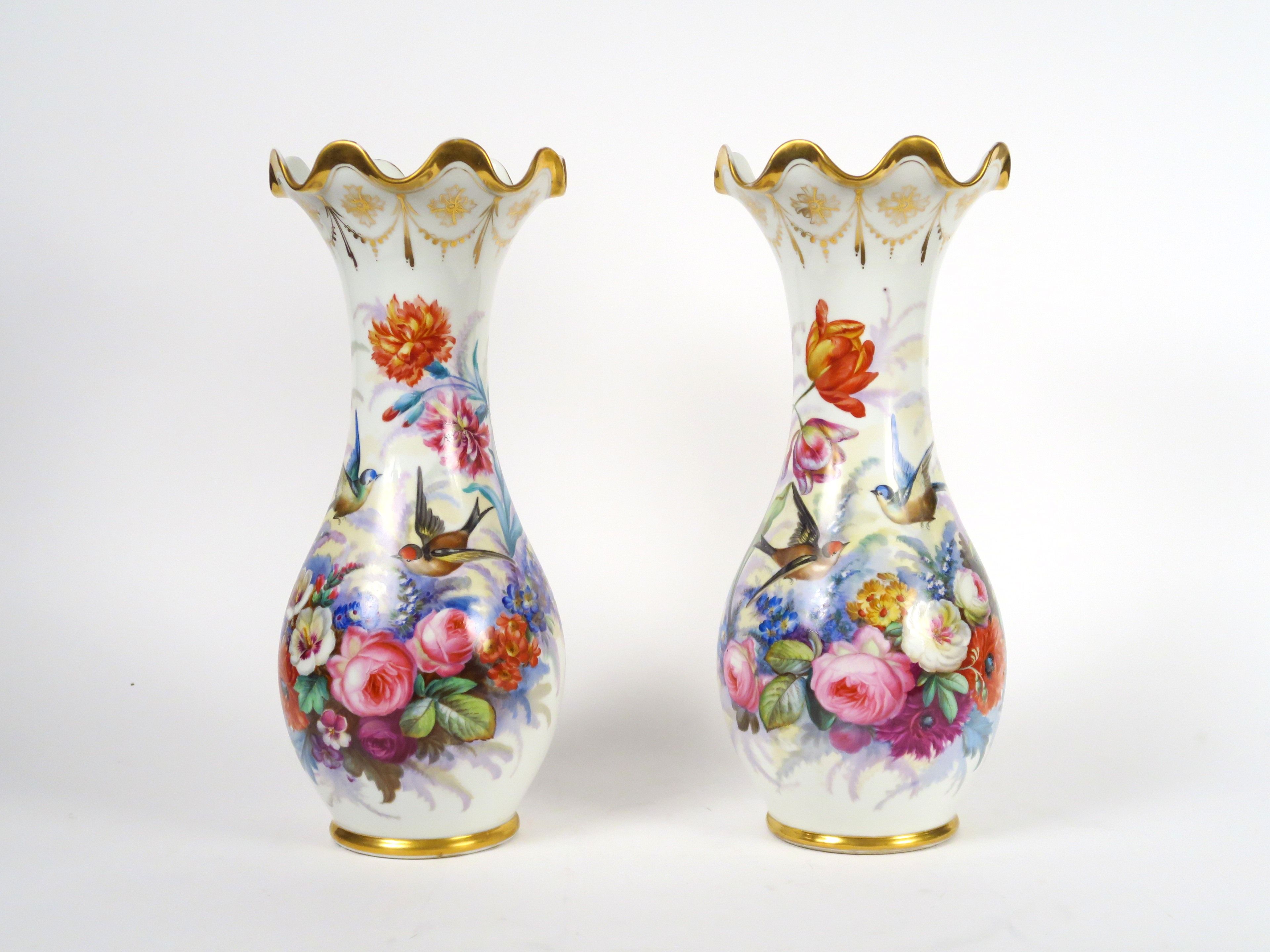 Paire de vases Napoléon III en porcelaine de Paris, à décor polychrome et doré d'oiseaux et de fleurs, col évasé polylobé. H. 44,5 cm