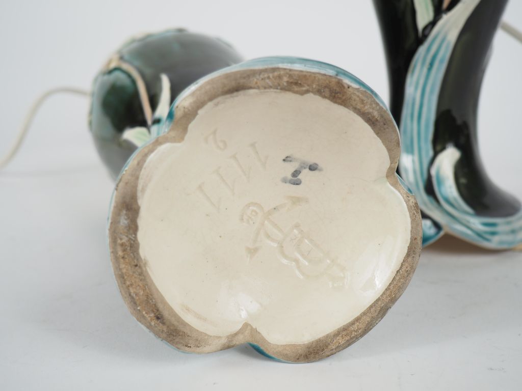 Paire de vases ovoïdes Art Nouveau en barbotine à décor polychrome d'iris, montés en lampe. H. 24,5 cm