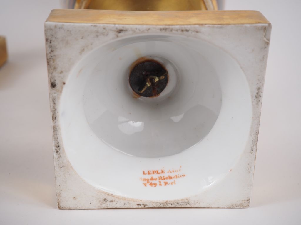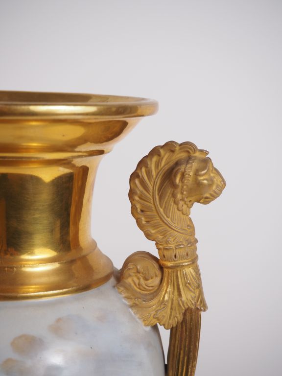 Paire de vases Restauration en porcelaine de Paris à décor de scènes de chasse, anses en forme de gueule de lion. Porte la marque rouge Leplé Ainé à Paris. H. 42 cm