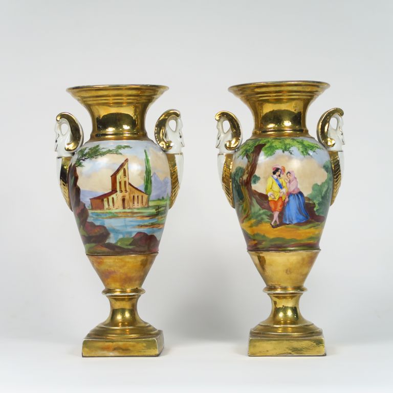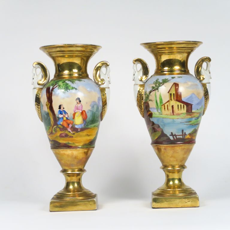 Paire de vases Restauration en porcelaine polychrome à décor de scènes galantes et de paysages. H. : 33,5 cm.